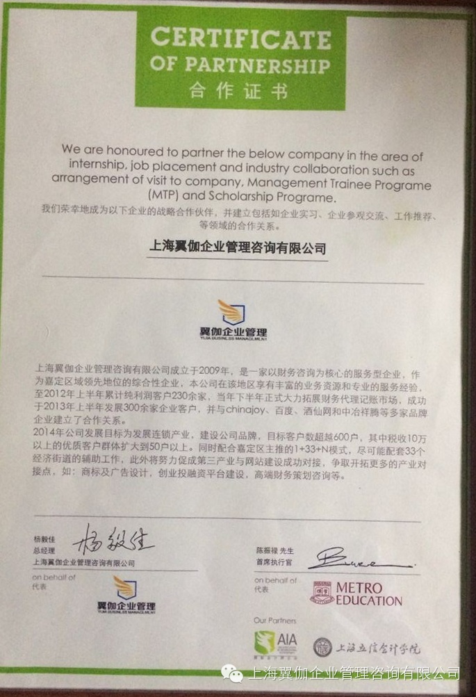 同年六月,翼伽与立信会计学院达成人才输送合作,翼伽在人才上的培养将趋于专业化、规模化,而翼伽即将开展的的财务产业联盟也将享有这些人才资源,在让更多的毕业生体验财务工作的同时,翼伽也将致力于与其他院校达成毕业生合作意向。