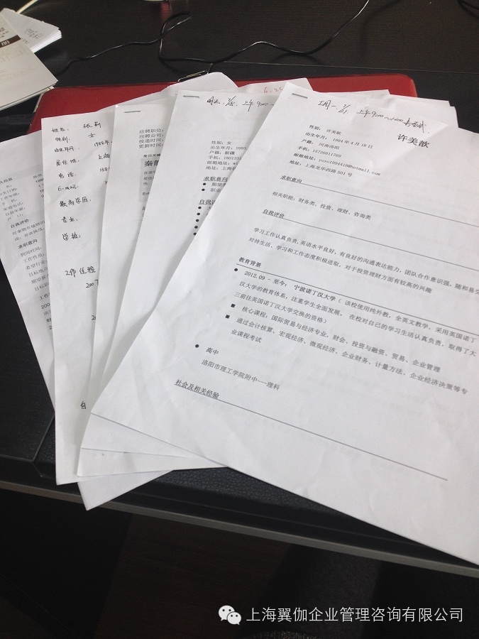 14:00---15:00 当前的翼伽,由于转走连锁加盟的发展之路,人才的储备就成为当务之急。在和“立信国际学院”等教育机构建立合作伙伴关系,由学校稳定地输送在校生或应届毕业生的同时,翼伽也在“前程无忧”等各大招聘网站上贴出了自己的招贤纳士贴,广招各路英雄加入翼伽的团队。因此在下午的这个时间段里,她通常会浏览收到的最新简历,从中筛选出翼伽的“有缘人”。